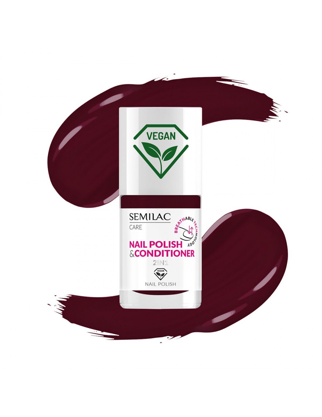 Semilac 024 Lakier Klasyczny z Odżywką 2w1 (7 ml) w odcieniu burgundowym łączy głęboki kolor z formułą BREATHable TECHnology, która umożliwia oddychanie paznokci i intensywnie je regeneruje. Wzbogacony o kwarc, minerały i żywicę pistacjową, zapewnia trwałość, połysk i efekt jak po hybrydzie już po jednej warstwie.