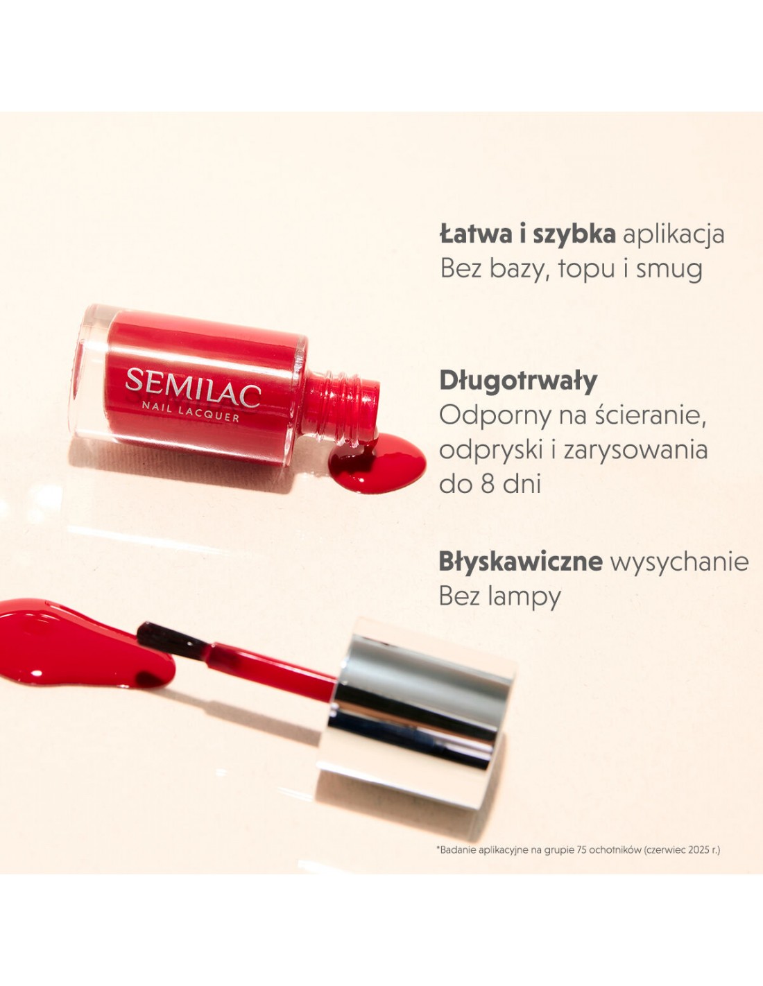 - Ergonomiczny pędzelek – aplikacja w dwóch pociągnięciach, bez smug