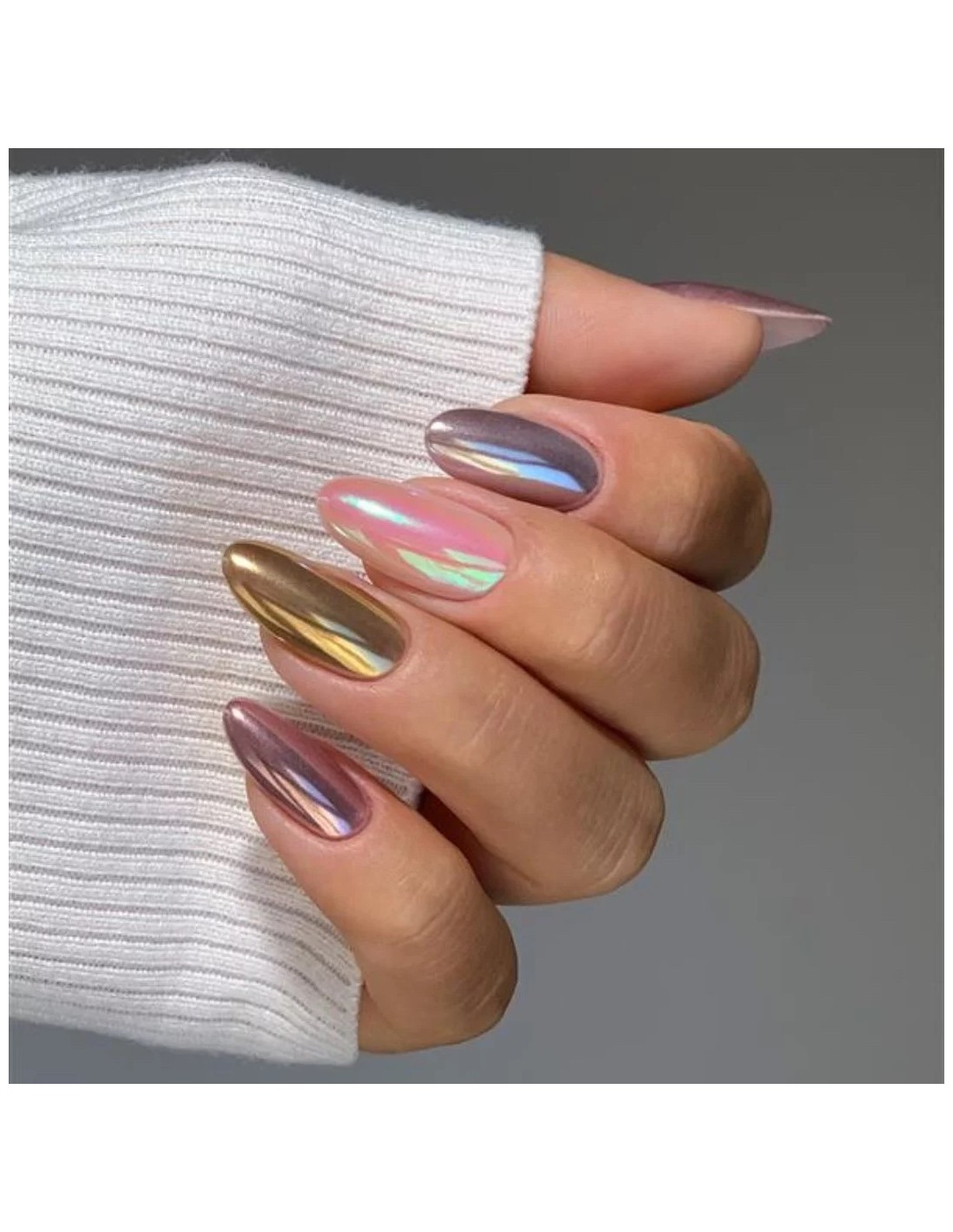 Paletka Trendylicious pozwala uzyskać metaliczny glow w stylu „liquid metal”, który pięknie prezentuje się zarówno na klasycznych hybrydach, jak i na półtransparentnych kolorach. W zależności od sposobu aplikacji możesz uzyskać efekt lustrzanego odbicia lub subtelnego, wielowymiarowego połysku.